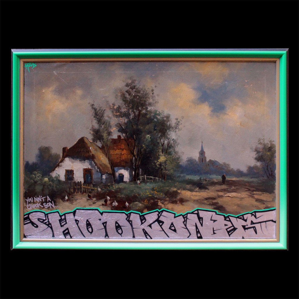 Shook Ones Posted on 14 april 2020 by Hoodkitsch Shook Ones – for sale.56×76 cm. Marker and spray paint on oil.GO TO STORE