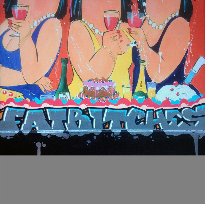 Fat Bitches Posted on 5 december 2020 by Hoodkitsch Fat Bitches – SOLD. 54×64 cm. Marker and Spray paint on print.