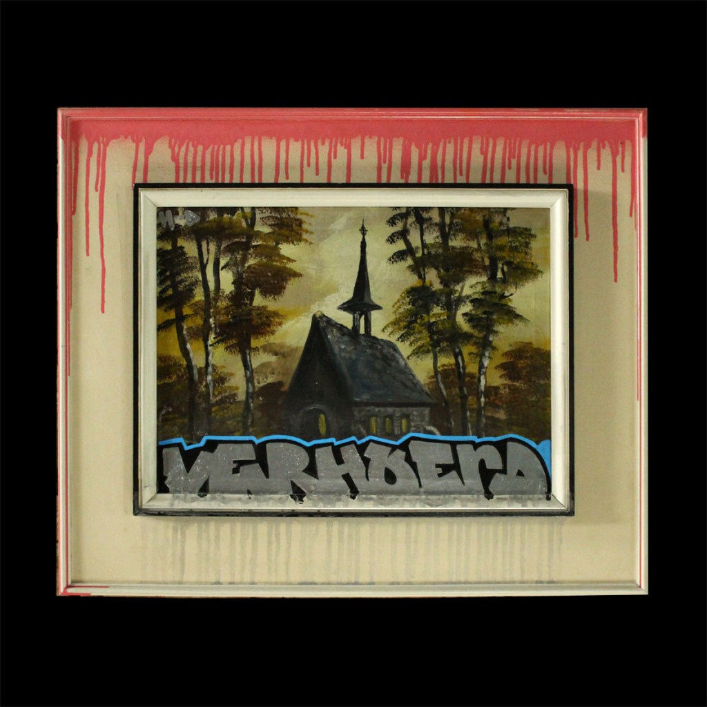 Verhoerd Posted on 1 november 2021 by Hoodkitsch Verhoerd – For Sale.48×58 cm. Marker and spray paint on oil painting.GO TO STORE
