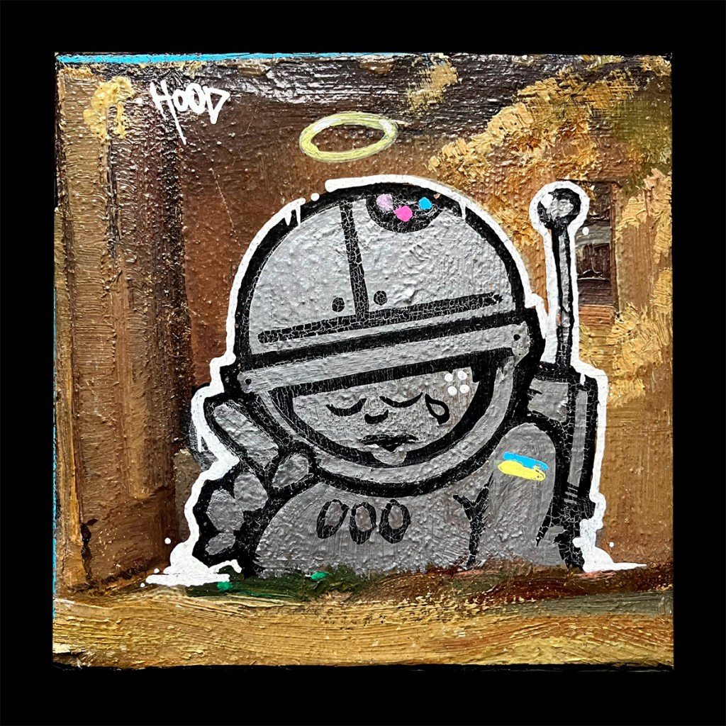 Sad Astronaut Posted on 26 maart 2026 by Hoodkitsch Sad Astronaut – Sold.10×10 cm. Marker on oil.GO TO STORE