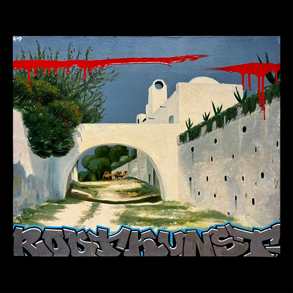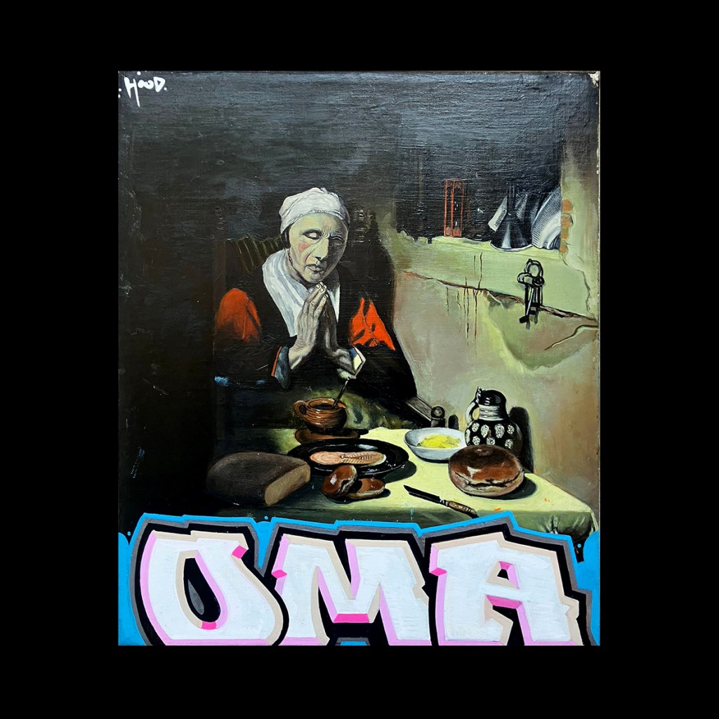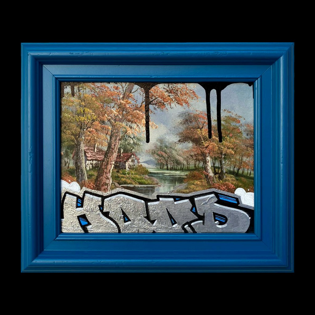 50×60 cm. Spray paint and marker on reclaimed oil painting.