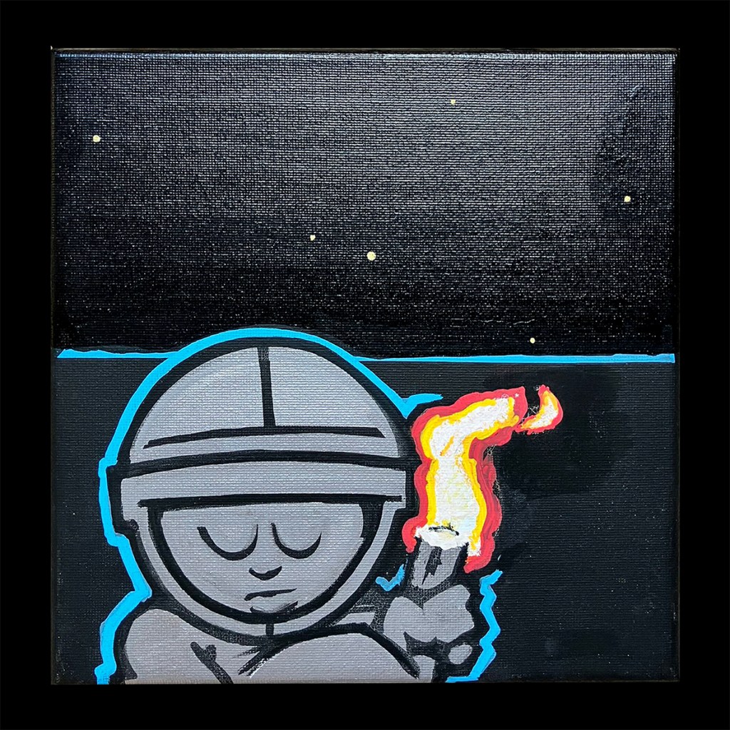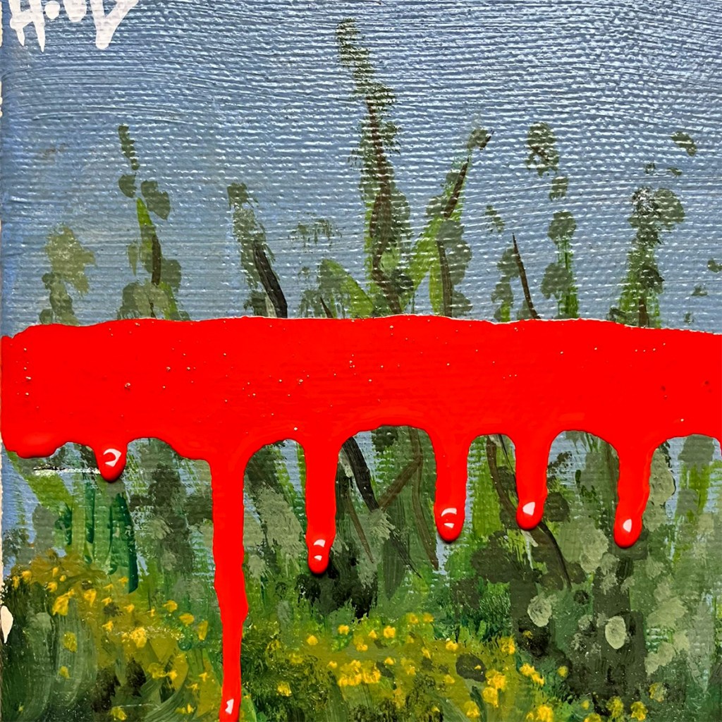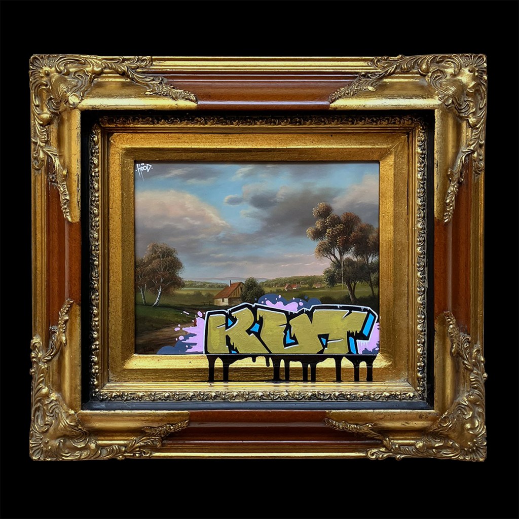 29×33 cm. Spray paint and marker on reclaimed oil painting.