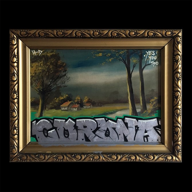18×23 cm. Spray paint on wood & metal.