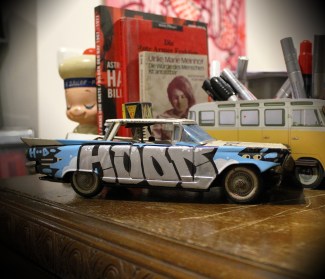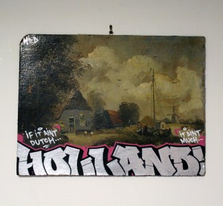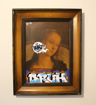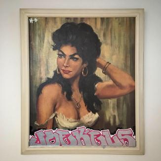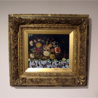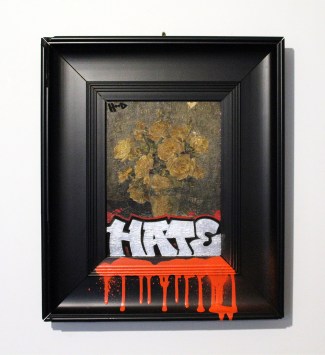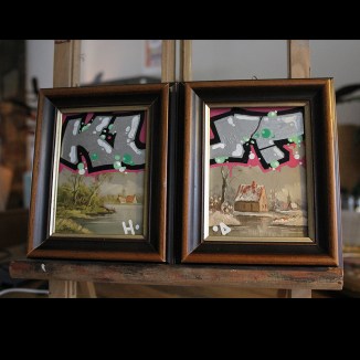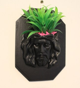 21×15 cm. Spraypaint, fishtank pebbles and a plastic plant.