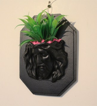 21×15 cm. Spraypaint, fishtank pebbles and a plastic plant.
